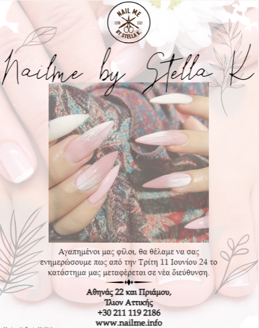 Το ολοκαίνιουριο κατάστημά μας βρίσκεται επί της οδού Αθηνάς 22 & Πριάμου στο Ίλιον Αττικής. Σε μας θα βρείτε μια πλήρη γκάμα υπηρεσιών ομορφιάς που καλύπτουν όλες σας τις ανάγκες. Κλείστε τώρα το ραντεβού σας και επισκεφθείτε το χώρο μας για μια μοναδική εμπειρία ομορφιάς. Ενδεικτικά, μερικές από τις υπηρεσίες που μπορείτε να επιλέξετε στο κατάστημα Nail me by Stella K είναι: